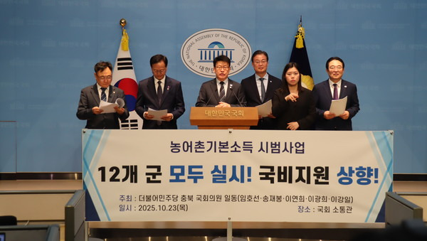 더불어민주당 충북지역 국회의원 일동은 23 일 , 「 농어촌기본소득 」 시범사업의 시행 대상을 농식품부가 발표한 1 차 선정 12 개 지역으로 확대하고 국가 지원 비중을 50% 로 상향할 것을 촉구하는 기자회견을 열었다 .