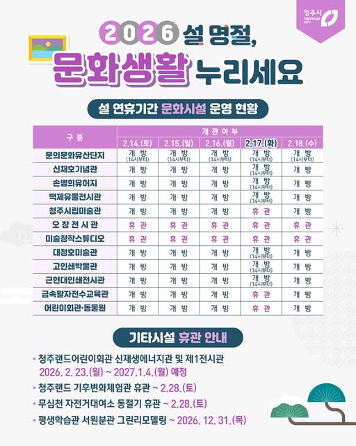 이 밖에도 청주시립미술관과 금속활자전수교육관, 청주랜드 어린이회관, 청주동물원도 설 당일(17일)을 제외하고 모두 문을 연다.