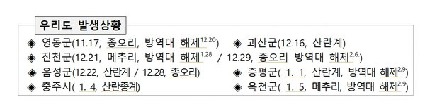도내 가금농장 발생 현황을 보면 충북 지역에서만 음성 2건, 진천 2건, 영동 1건, 증평 1건, 괴산 1건, 충주 1건, 옥천 1건 등 총 9건이 보고됐다.