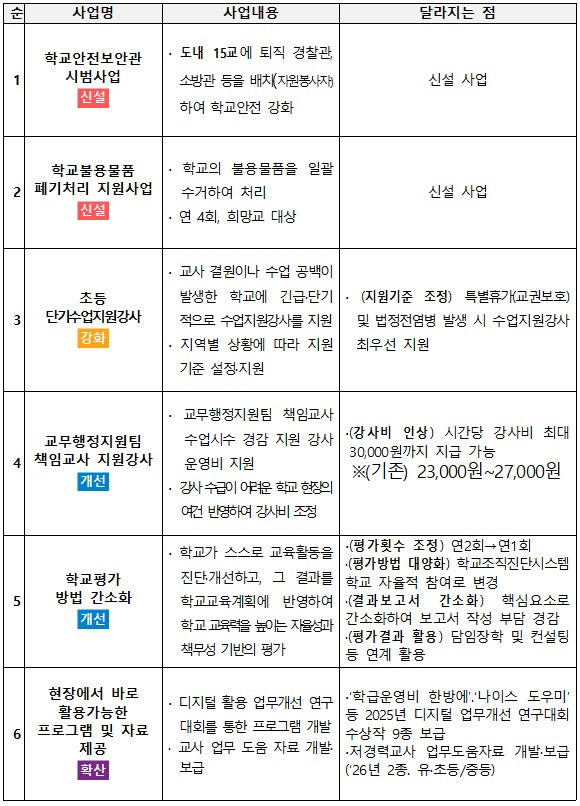 아울러 교사들이 바로 따라 쓰며 활용할 수 있는‘학급운영비 한방에’, ‘나이스 도우미’등 업무지원 프로그램을 보급하고, 학교평가 방법을 간소화하는 등 행정업무의 부담을 줄여 학교가 체감할 수 있는 실용적 지원을 확대해 나간다.