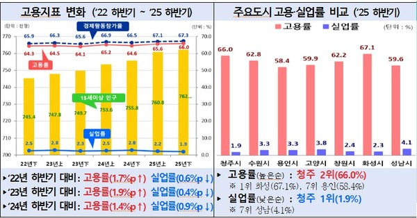 【청주일보】 김익환 기자 = 충북 청주시는 2025년 하반기 고용률(15세 이상)이 전년 동기 대비 1.4%p 상승한 66.0%를 기록했다고 9일 밝혔다.